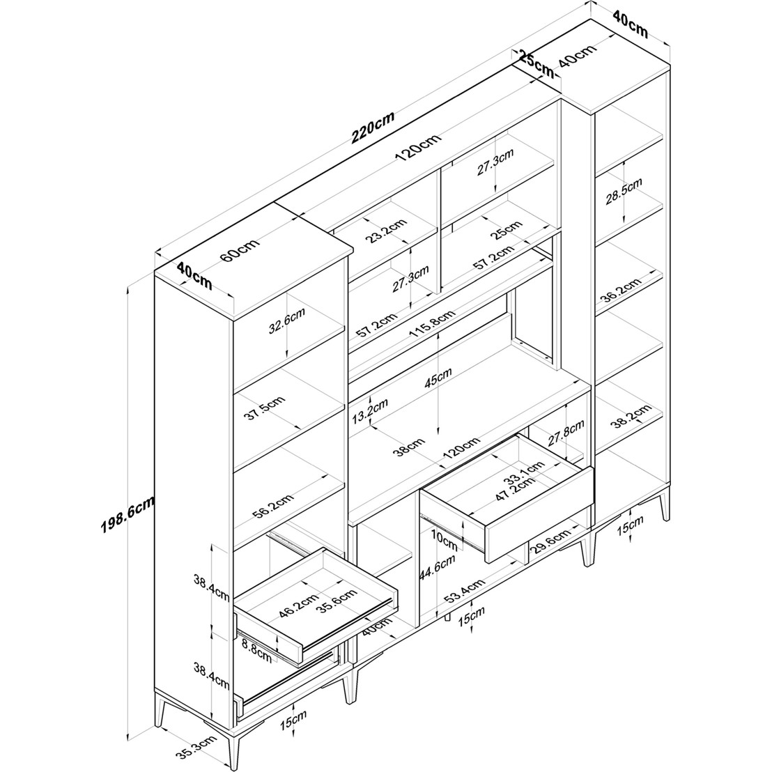 Genişlik: 220 cm – Derinlik: 40 cm – Yükseklik: 198,6 cm