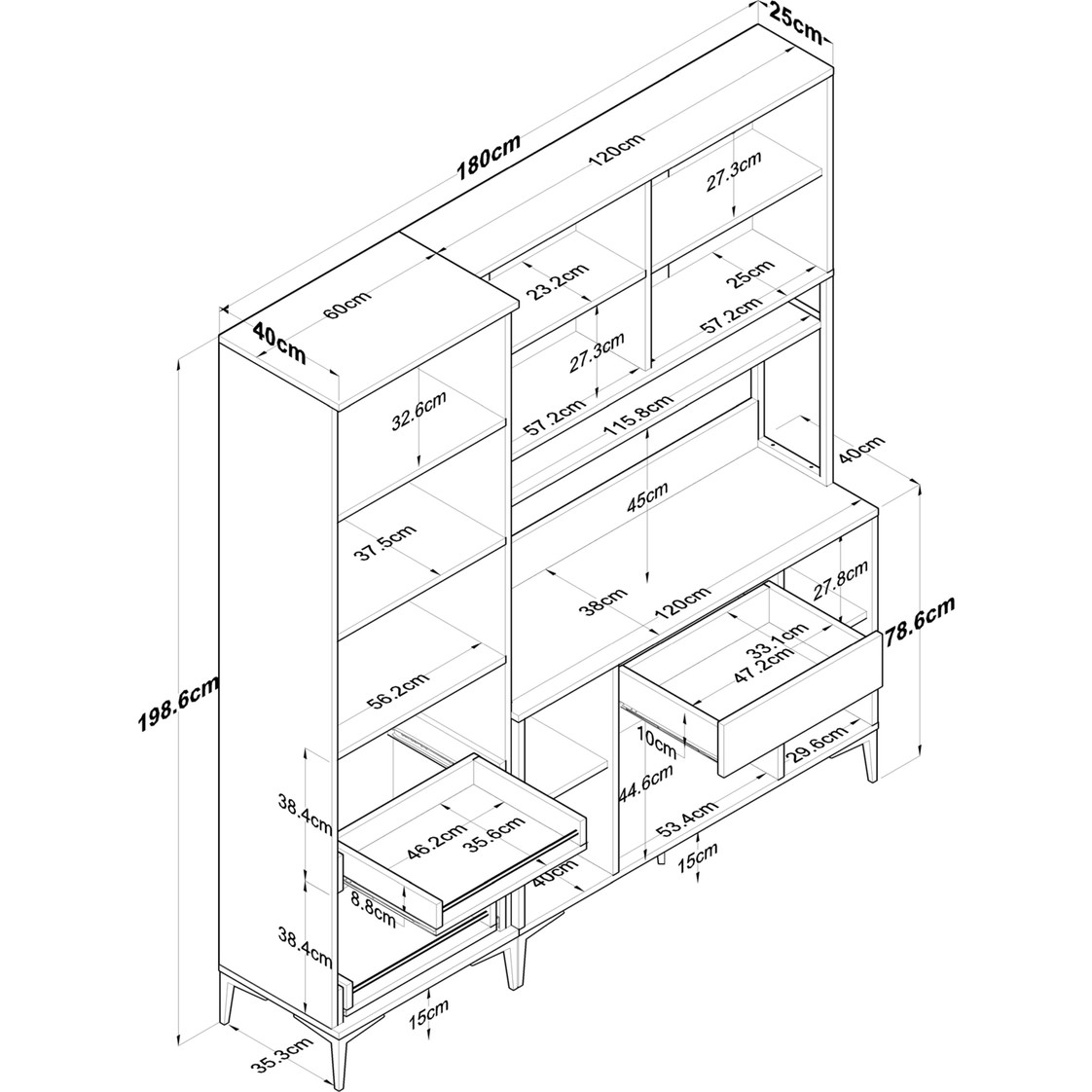 Genişlik: 180 cm – Derinlik: 40 cm – Yükseklik: 198,6 cm