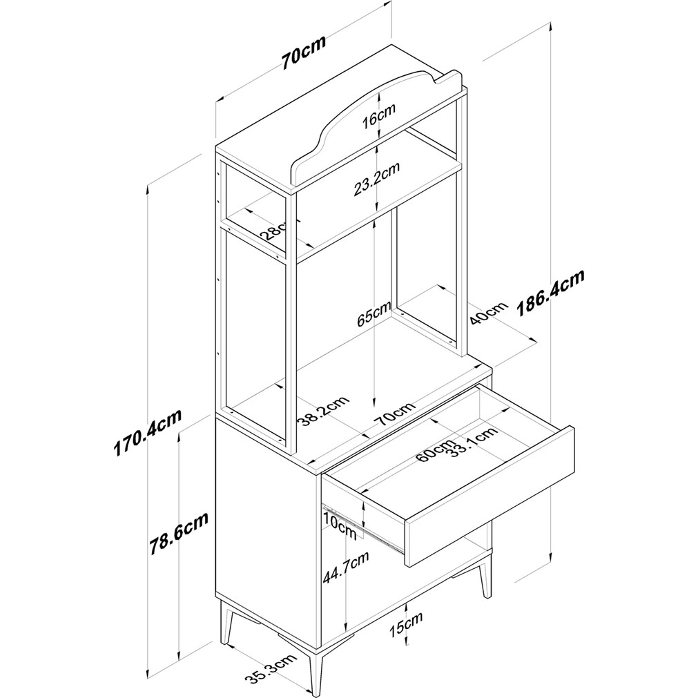 Genişlik: 70 cm – Derinlik: 40 cm – Yükseklik: 186,4 cm