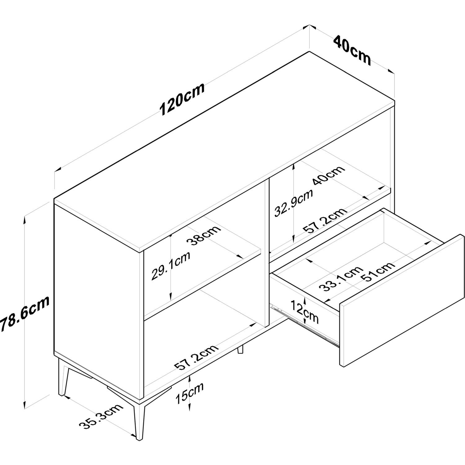 Genişlik: 120 cm – Derinlik: 40 cm – Yükseklik: 78,6 cm