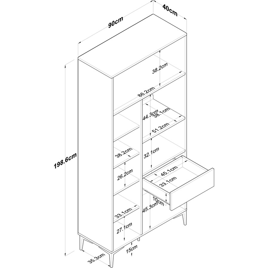 Genişlik: 90 cm – Derinlik: 40 cm – Yükseklik: 198,6 cm