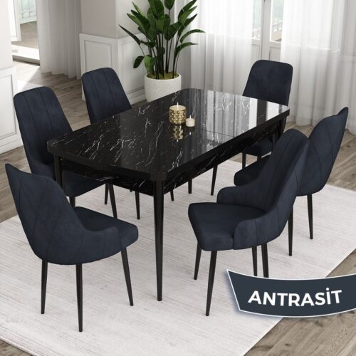 Canisa Concept Ram Serisi 80X132 Açılabilir Siyah Mermer Desen Yemek Masası Takımı 6 Babyface Kumaş Sandalye