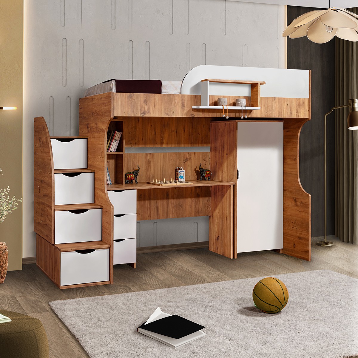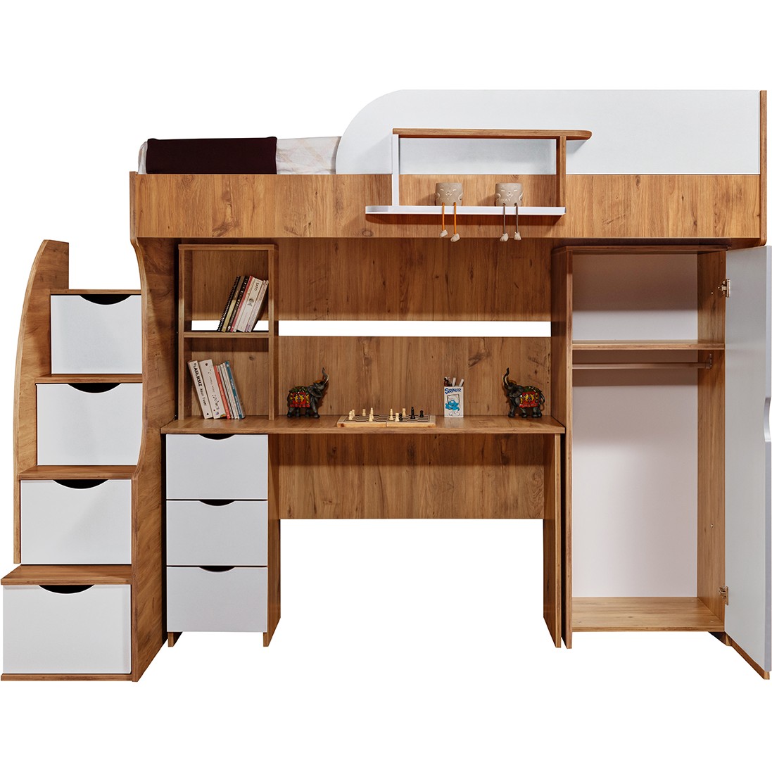 • Merdivende 2 tane menteşe kapaklı 2 tane raylı çekmece mevcuttur.