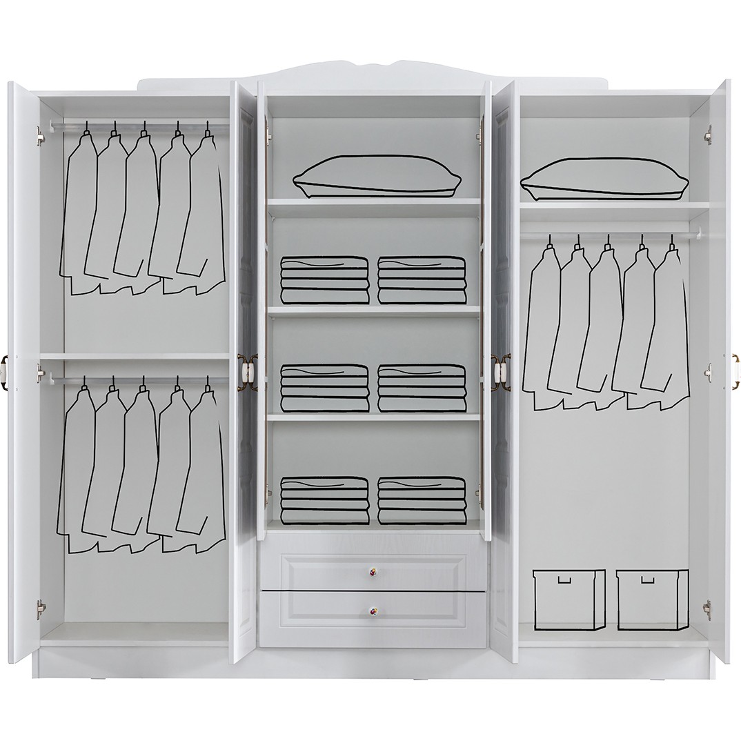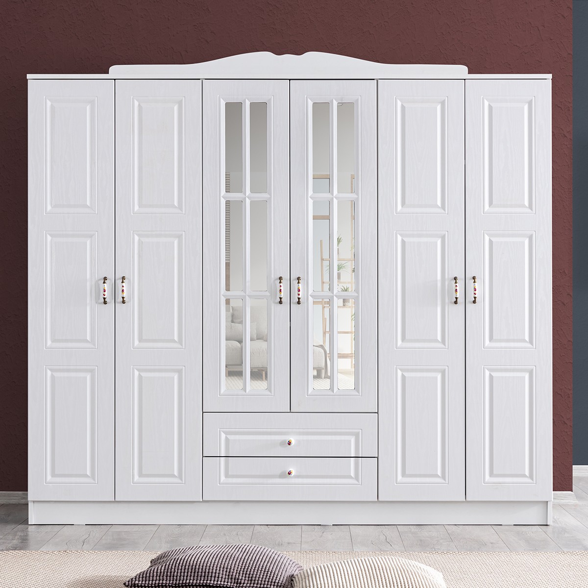 dolap 6 kapaklı 2 çekmeceli ve aynalıdır. Dolap içerisinde 3 askı bölümü 2 çekmece ve raflar yer almaktadır.