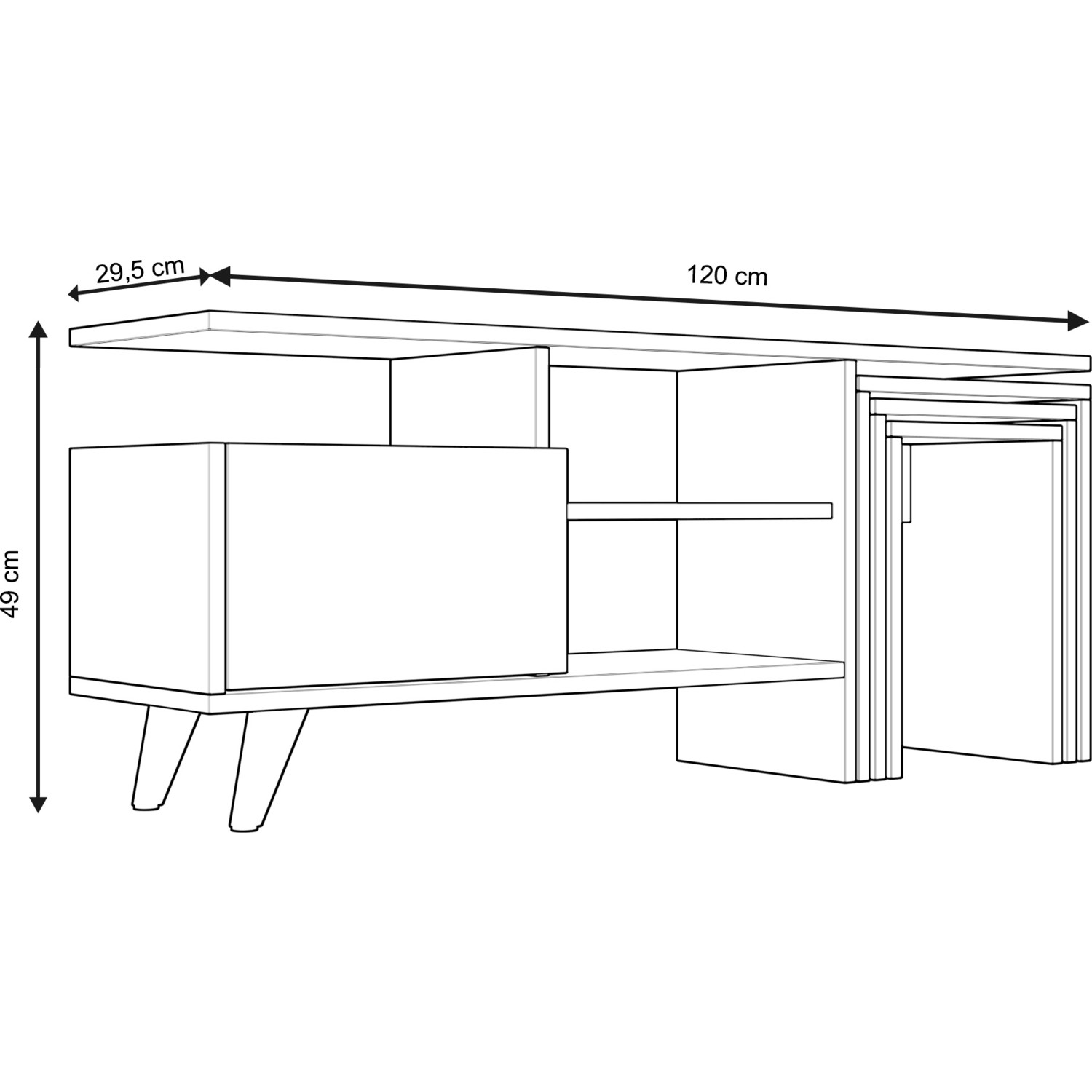 Yükseklik: 49 derinlik: 29 genişlik: 120 18 mm suntalamdan üretilmiştir. 0,4 mm pvc bant kullanılmıştır. Ayaklar plastiktir.