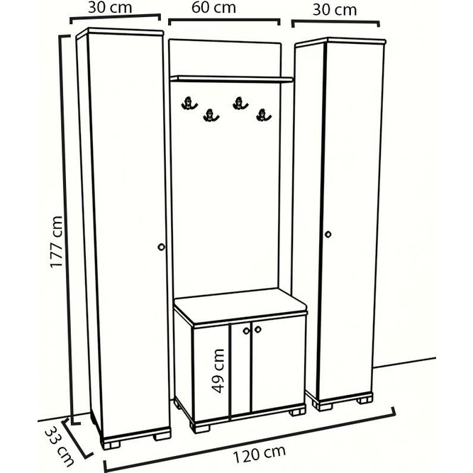 • Çevreye ve sağlığa zararsız, kanserojen madde içermeyen Avrupa E1 kalite standartlarında suntalamdan üretilmiştir. • Üründe 18 mm kalınlığında 1.Sınıf suntalam kullanılmaktadır. • Çevre ve çocuk sağlığına uygun malzemeler ile üretilmiştir. Ürün Ölçüleri • Yükseklik: 177 cm • Genişlik: 30 cm +60 cm + 30 cm = 120 cm • Derinlik: 33 cm