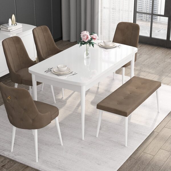 Canisa Concept Noa Serisi, 80X132 Açılabilir Benchli Mdf Beyaz Mutfak Masa Takımı, 4 Sandalye 1 Bench