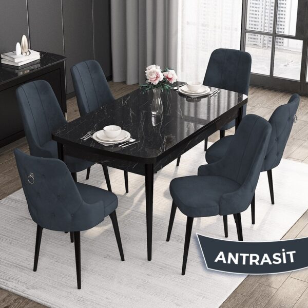 Canisa Concept Noa Serisi,80 x 132 cm Açılabilir Mdf Masa Takımı,siyah Mermer Desen Masa 6 Sandalye Gümüş Halkalı
