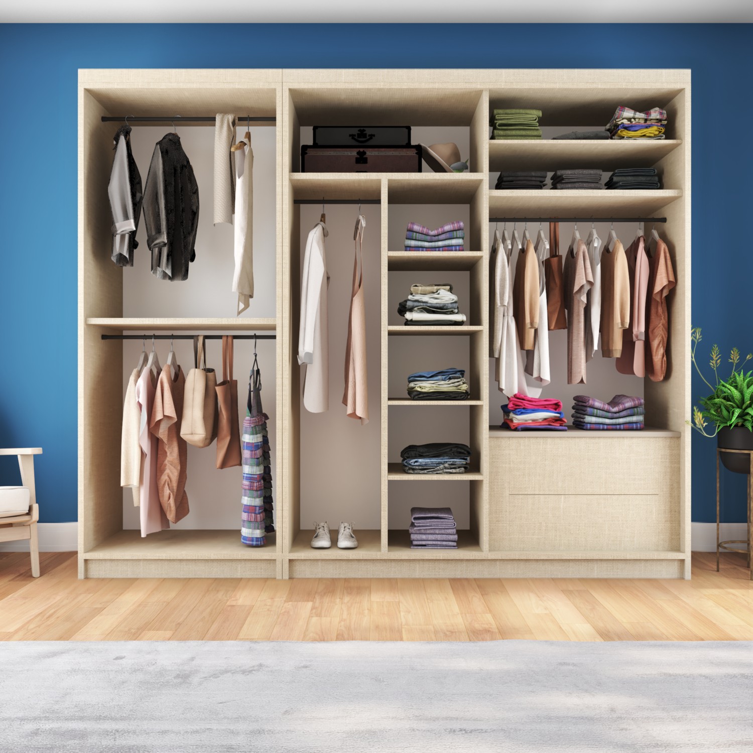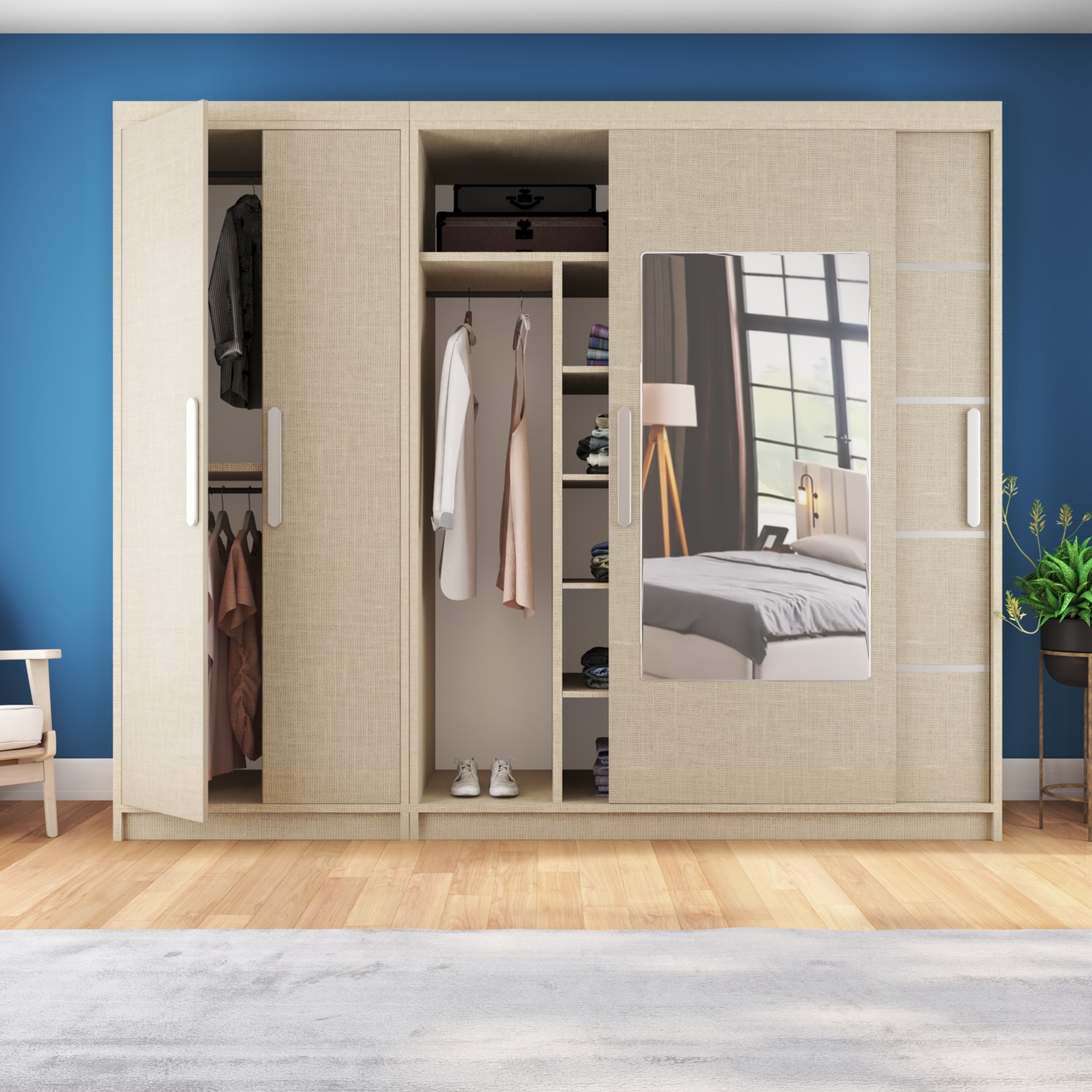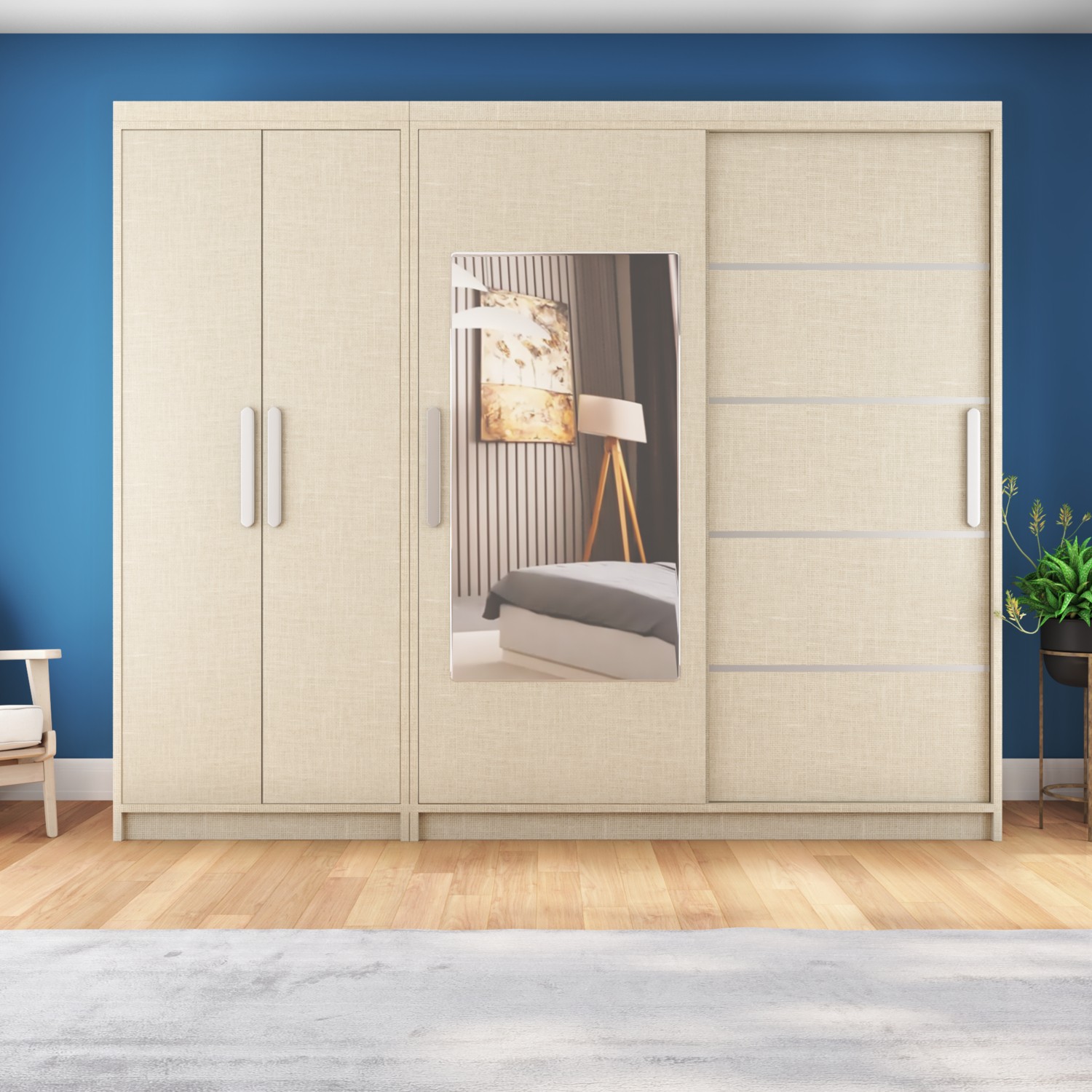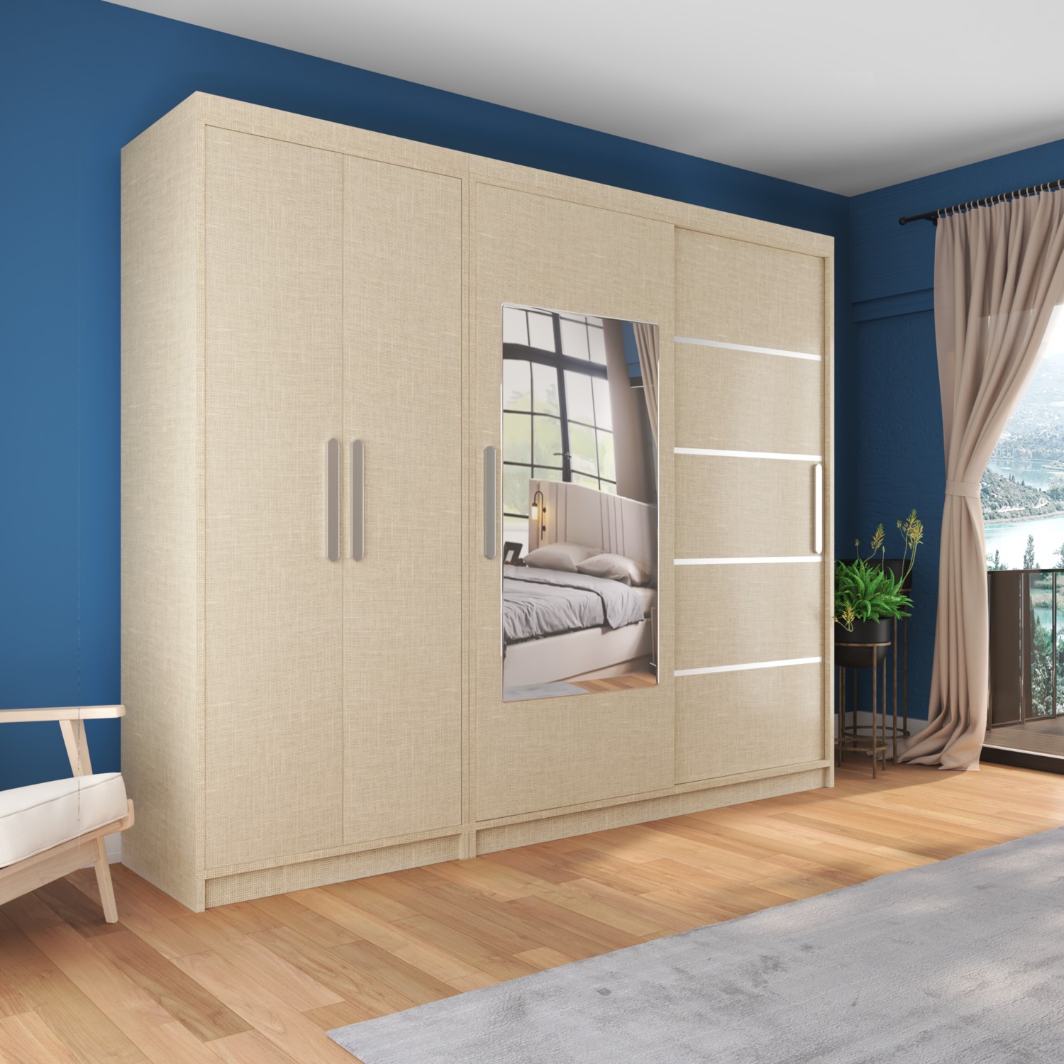 – Geniş iç hacmiyle 270 cm genişliğinde ve 60 cm derinliğinde tasarlanmış, geniş saklama alanı sunar.; – Modern tasarımıyla evinizin dekorasyonuna şık bir dokunuş katar.; – Aynalı kapakları sayesinde hem şık görünüm sağlar hem de odanızın daha ferah görünmesine yardımcı olur.; – Suntalam gövde materyali ile dayanıklılık ve uzun ömürlü kullanım vaat eder.; – 4 kapaklı yapısıyla düzenli bir görünüm ve kolay erişim imkanı sunar.; – Sürgülü fonksiyonu sayesinde kapıları kolayca açılıp kapanabilir, yerden tasarruf sağlar.; Sol Taraf Boydan Kapaklı Dolap Yeri Ölçüsü En: 90 cm’dir.; Sürgülü Gardırop Tarafı Ölçüsü En: 180 cm’dir.; Yükseklik Ölçüleri 210 cm’dir.;
